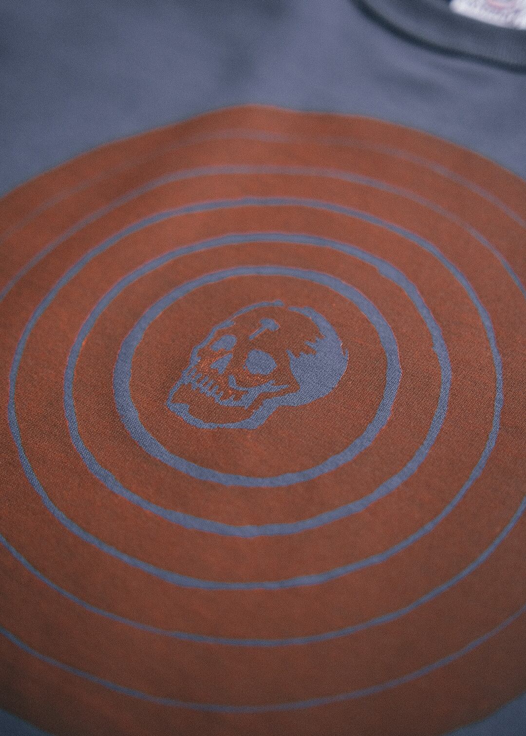 オリジナルの手彫り木版で、Brown Sugar Recordsの象徴であるLP盤とスカルマークをプリントしたレタープレスTシャツ。