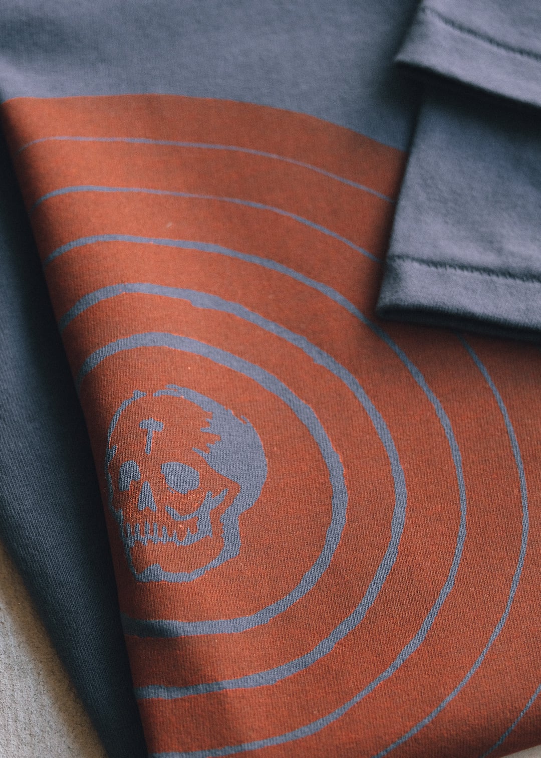 こちらの商品はレタープレス(活版印刷)という手法でプリントされています。インクを塗った飯をハンコのように直接Tシャツにプレスする手法でとても手間がかかるため一般的にTシャツのプリントに用いられることは少ないのですが、温かみのある仕上がり、生地とともに徐々に色落ちしていくエイジングがお楽しみいただけます。