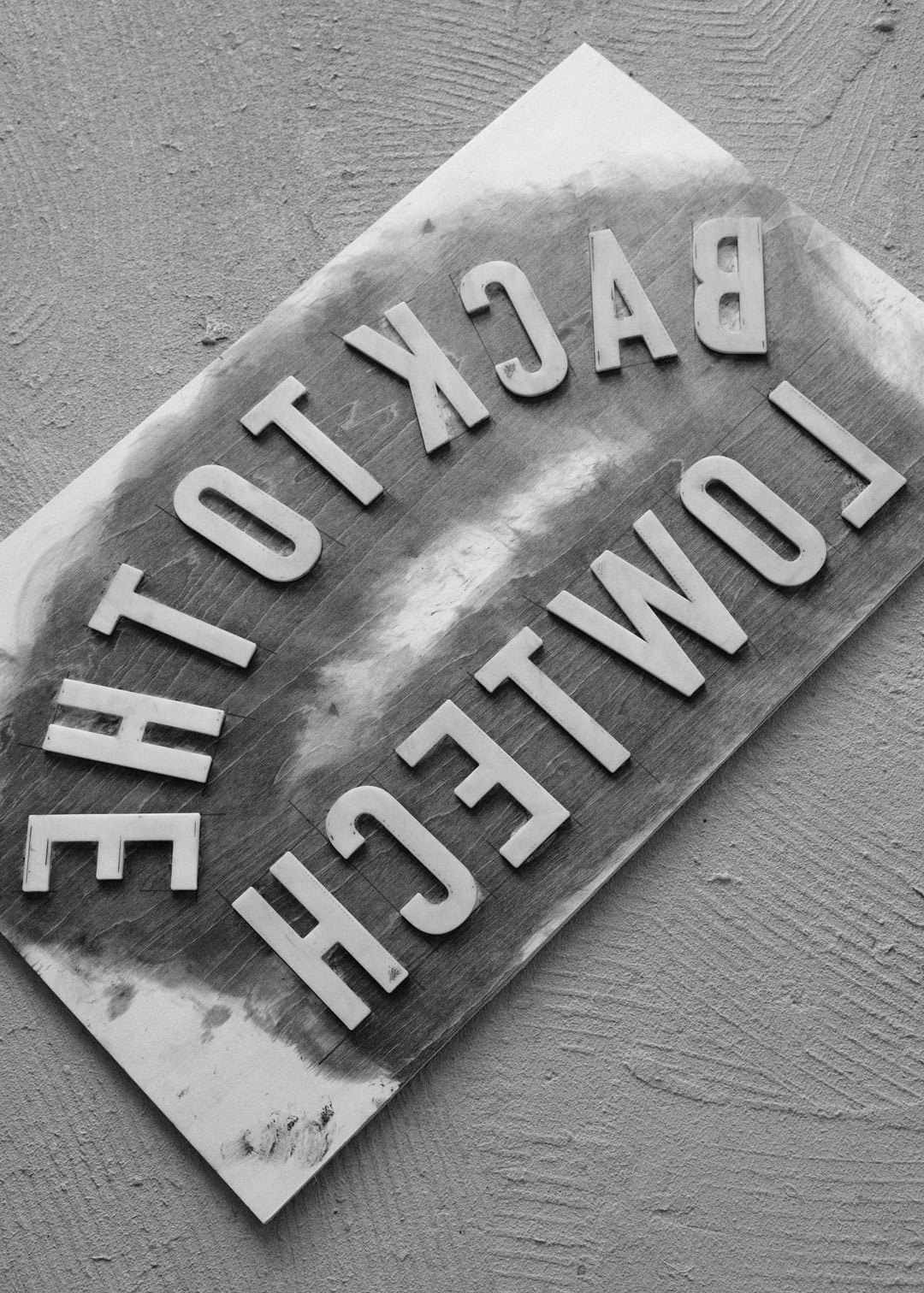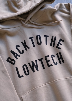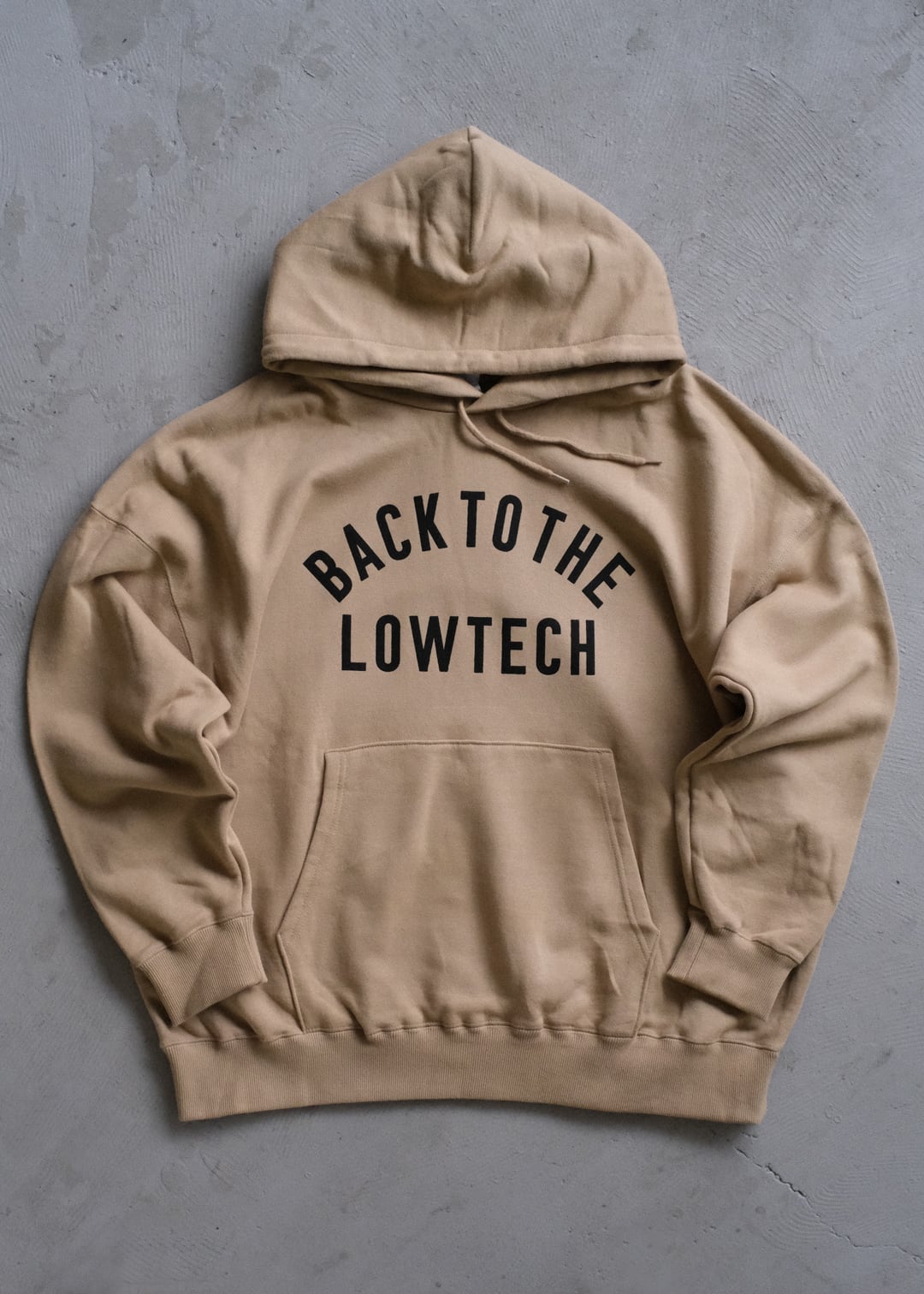 2025AWのテーマである"BACK TO THE LOWTECH"の文字を胸にレタープレスプリント(活版印刷)したビッグシルエットフーディー(パーカ)。