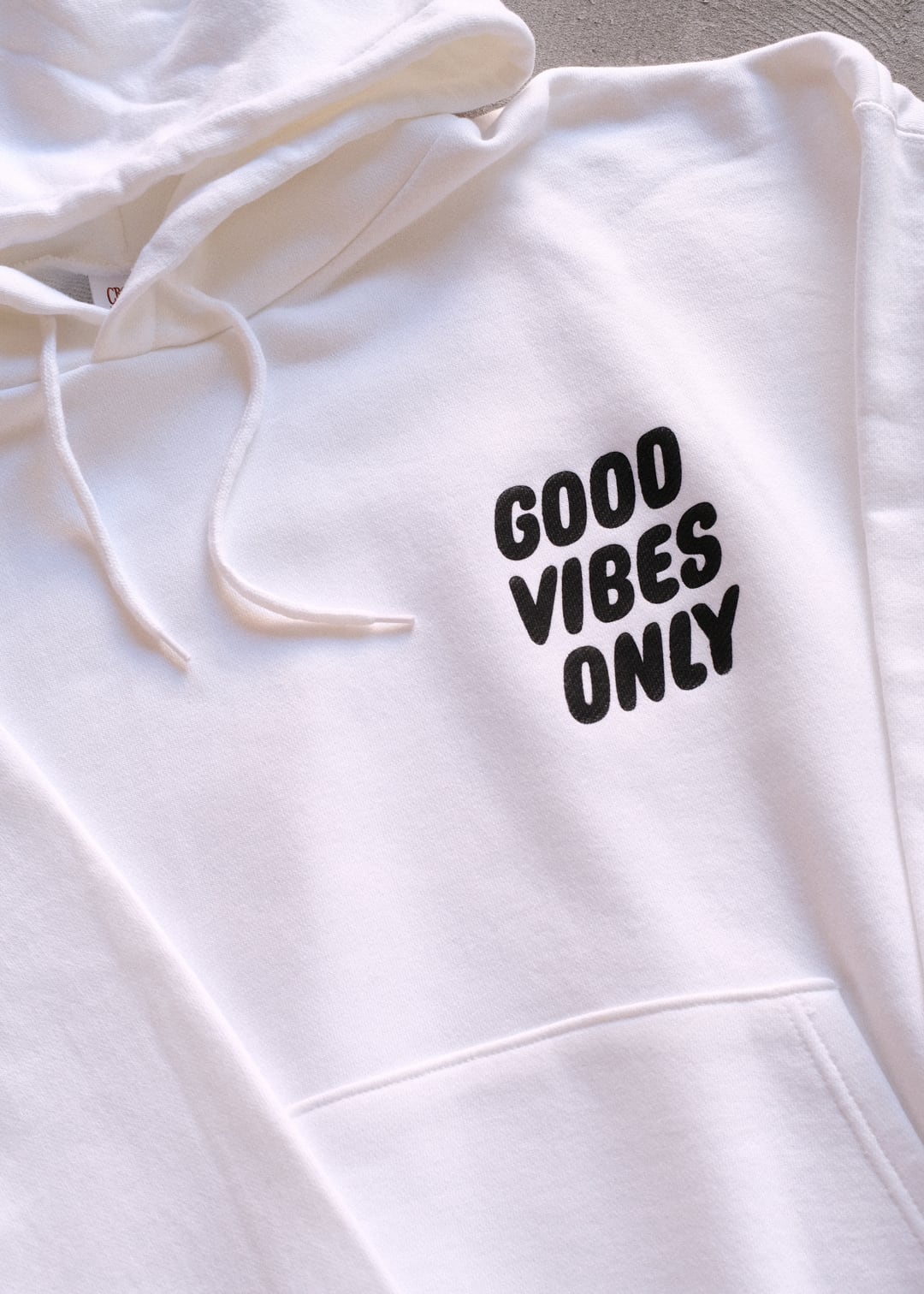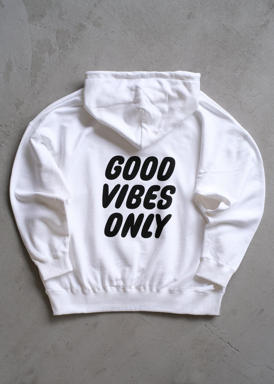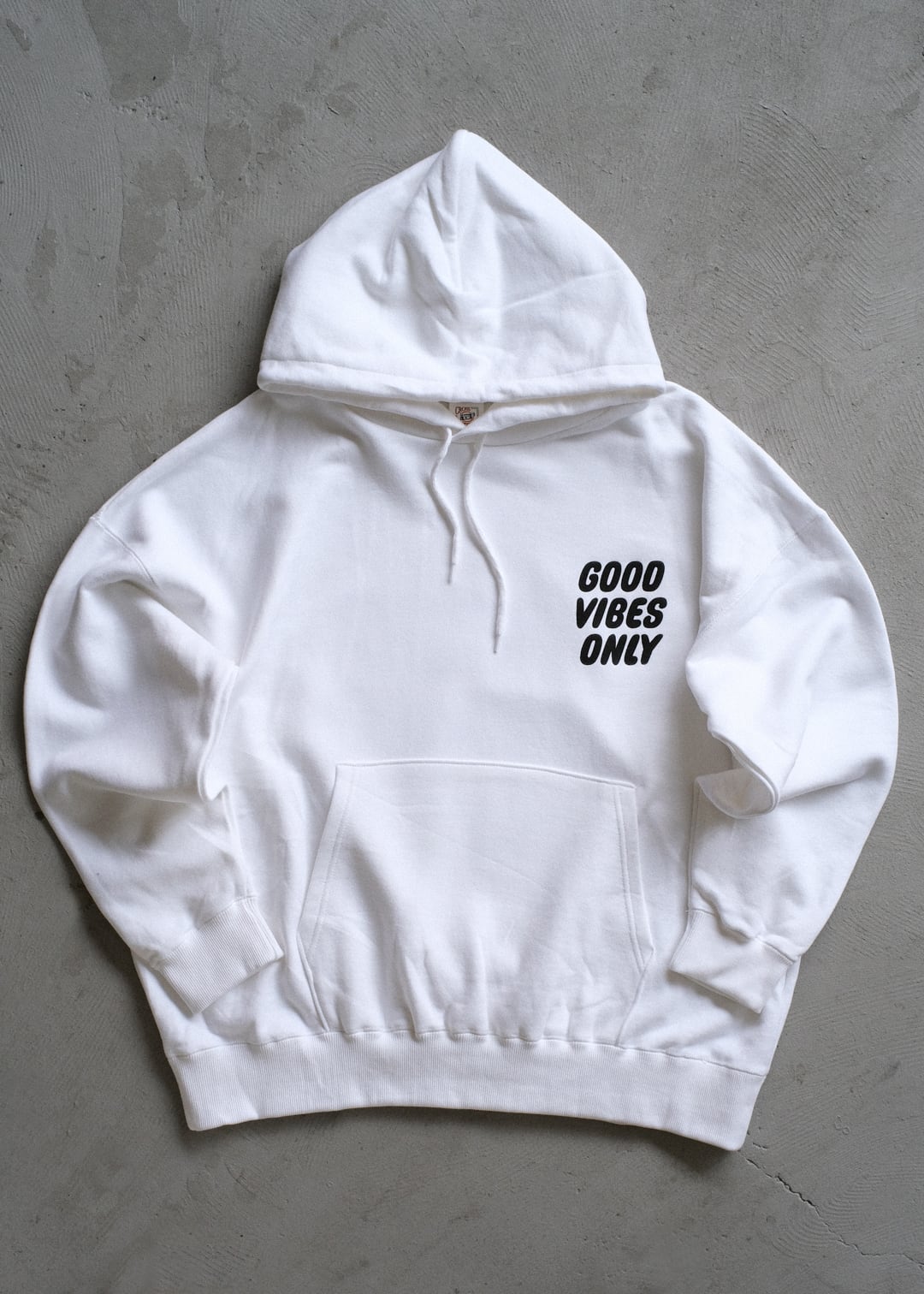 左胸と背中に"GOOD VIBES ONLY"の文字をレタープレスプリント(活版印刷)したビッグシルエットフーディー(パーカ)。