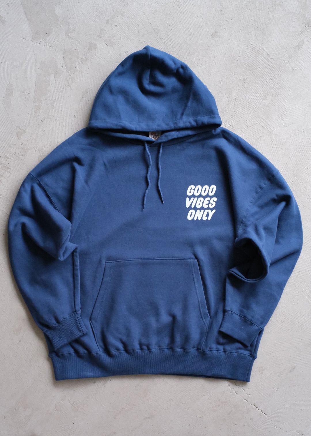 左胸と背中に"GOOD VIBES ONLY"の文字をプリントしたビッグシルエットフーディー(パーカ)。
