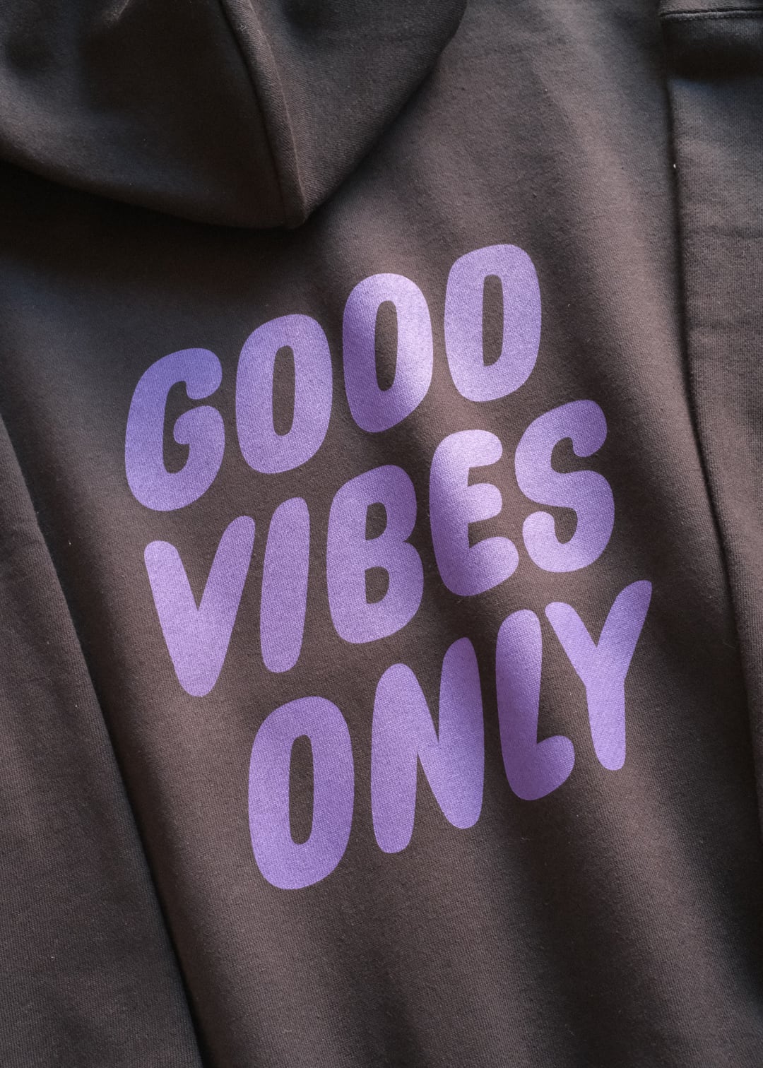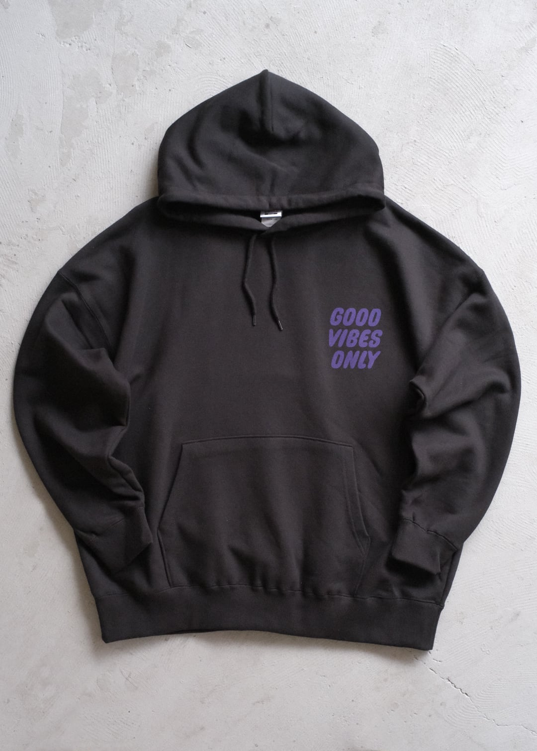 左胸と背中に"GOOD VIBES ONLY"の文字をプリント(活版印刷)したビッグシルエットフーディー(パーカ)。