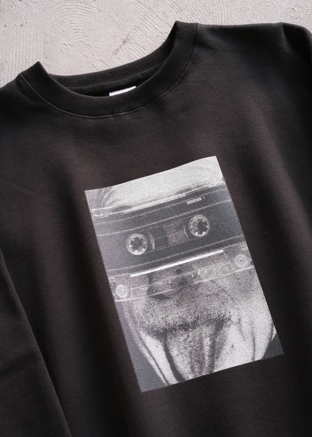 カセットテープで目隠しをしたアインシュタイン博士を胸にプリントしたビッグシルエットスウェット。写真は合成ではなく、写真とカセットテープを組み合わせて同時撮影しています。写真は網点を粗くし、あえてレトロ感を演出。音楽好き、特に私のようなカセットテープ好きの方にぜひ着用していただきたい遊び心のある一枚です。