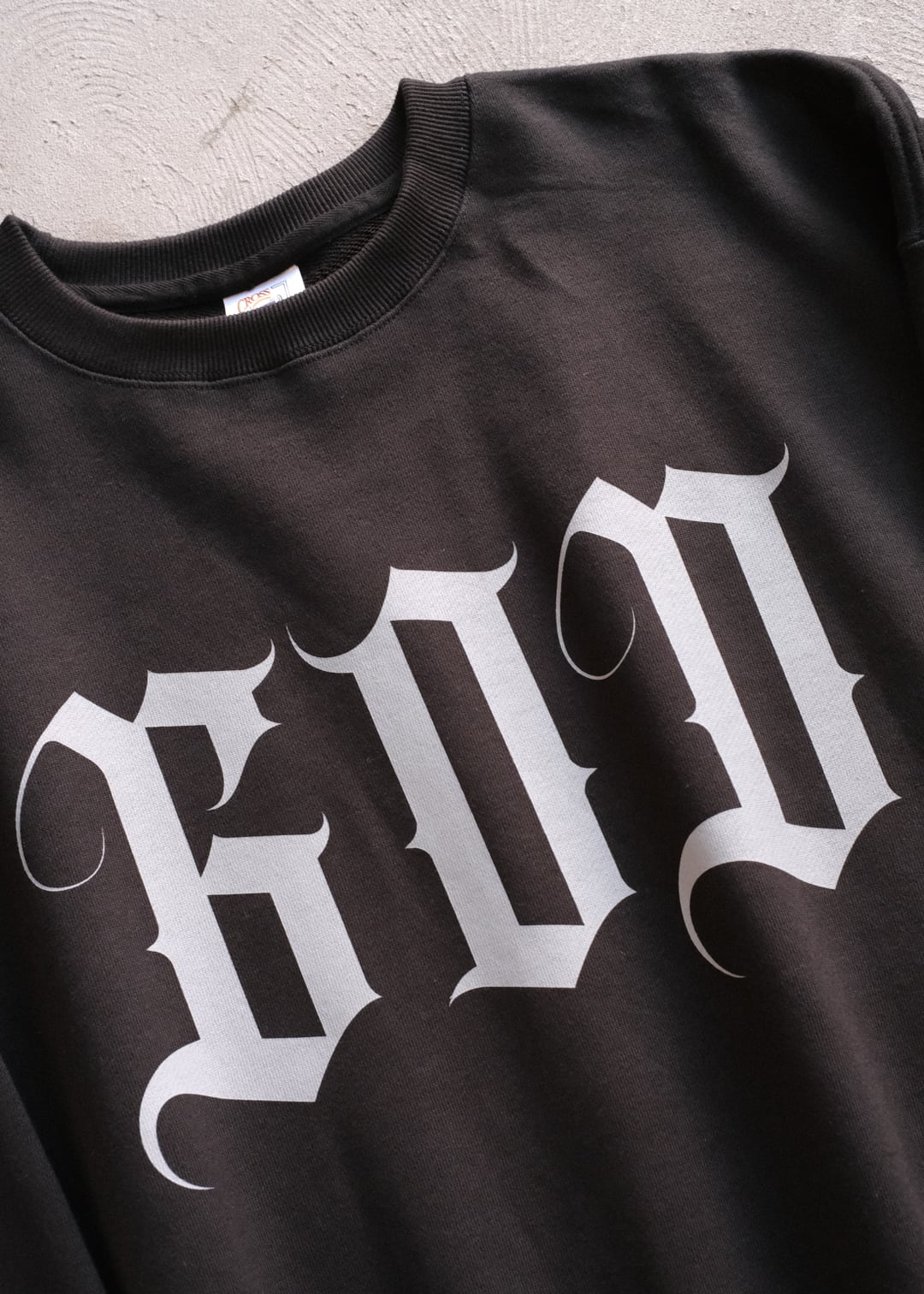 フォントはフラクトゥールいわゆるドイツ文字を使用。シックにもストリートにも使える汎用性の高いビッグシルエットスウェットです。