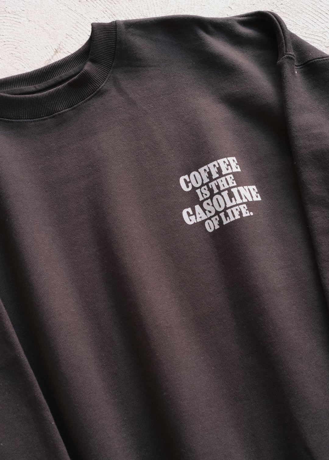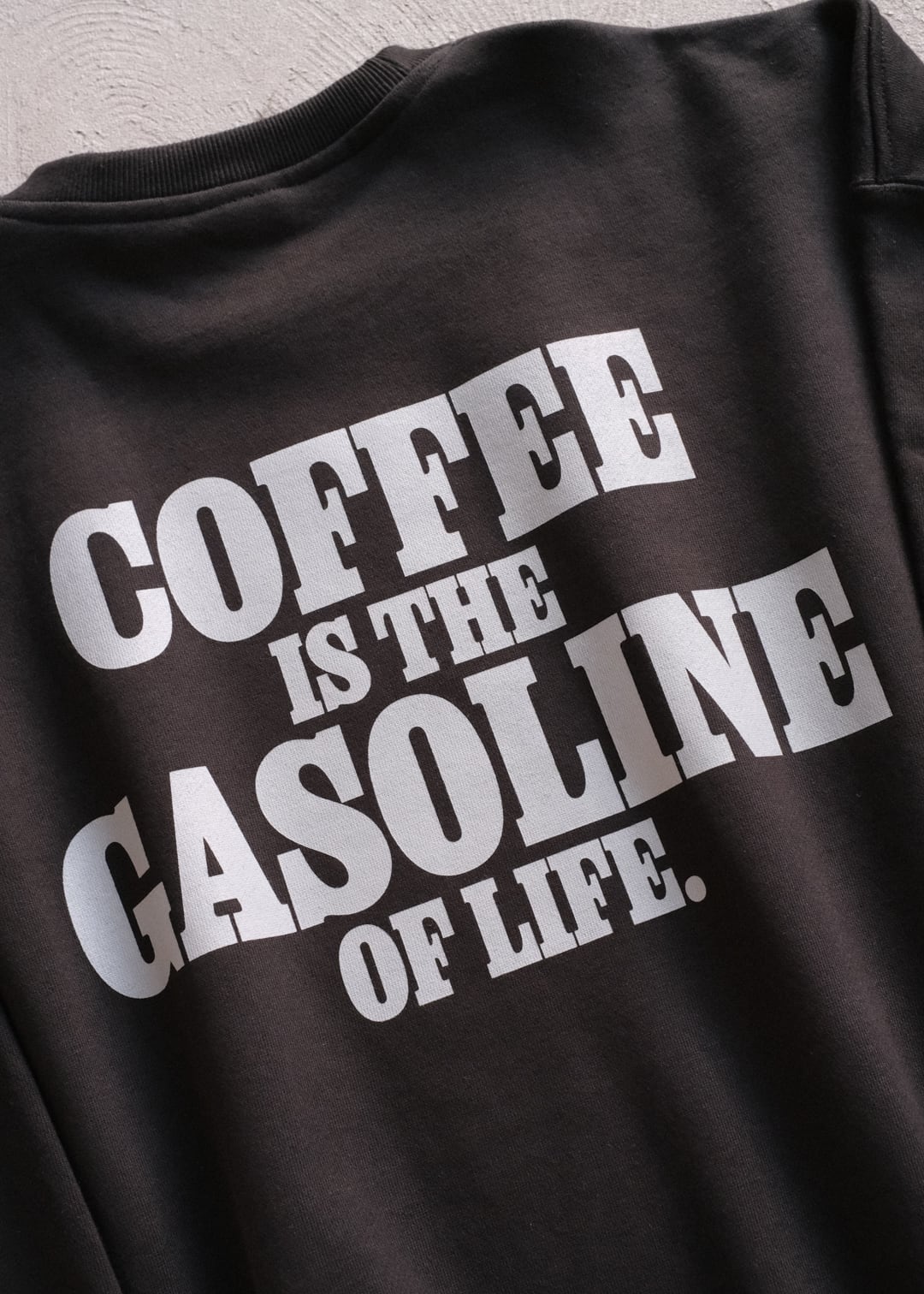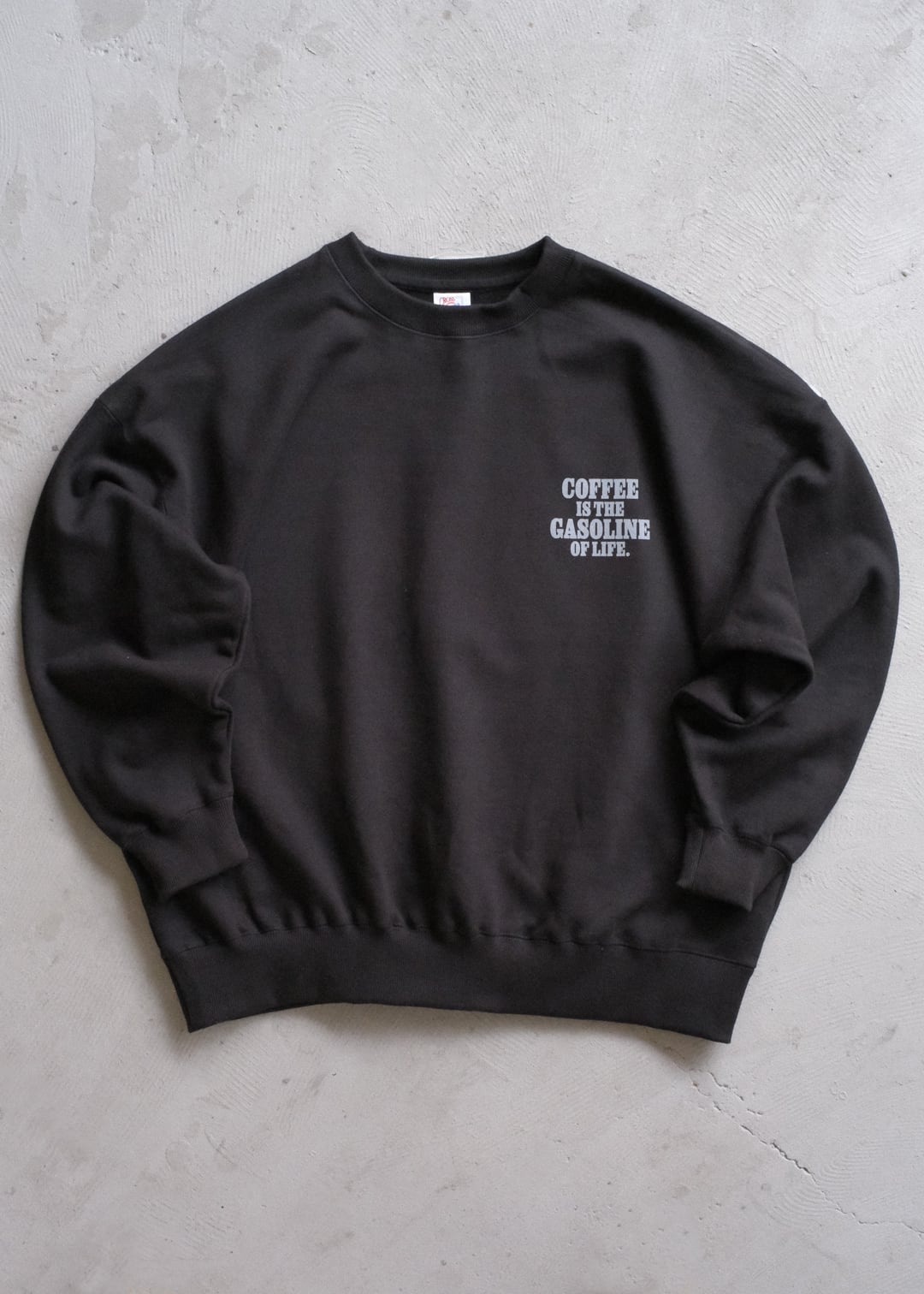 海外のカフェの入り口で見かけたコーヒー好きにはたまらないフレーズを左胸と背中にプリントしたビッグシルエットスウェット。