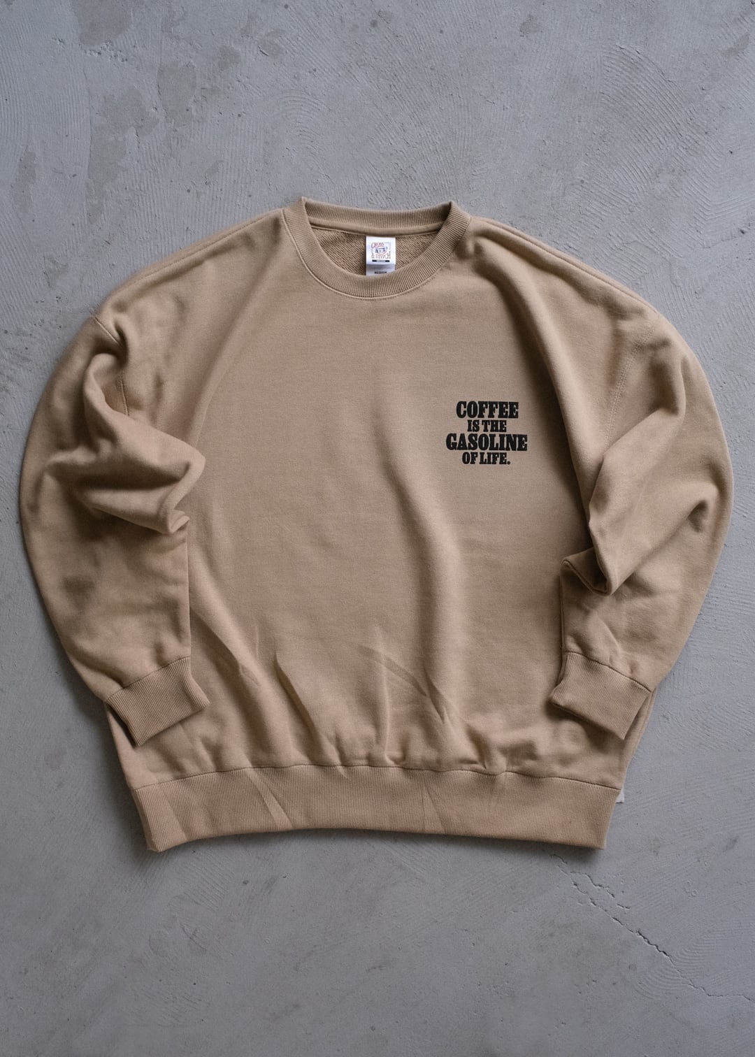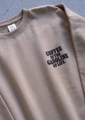 海外のカフェの入り口で見かけたコーヒー好きにはたまらないフレーズを左胸と背中にプリントしたビッグシルエットスウェット。