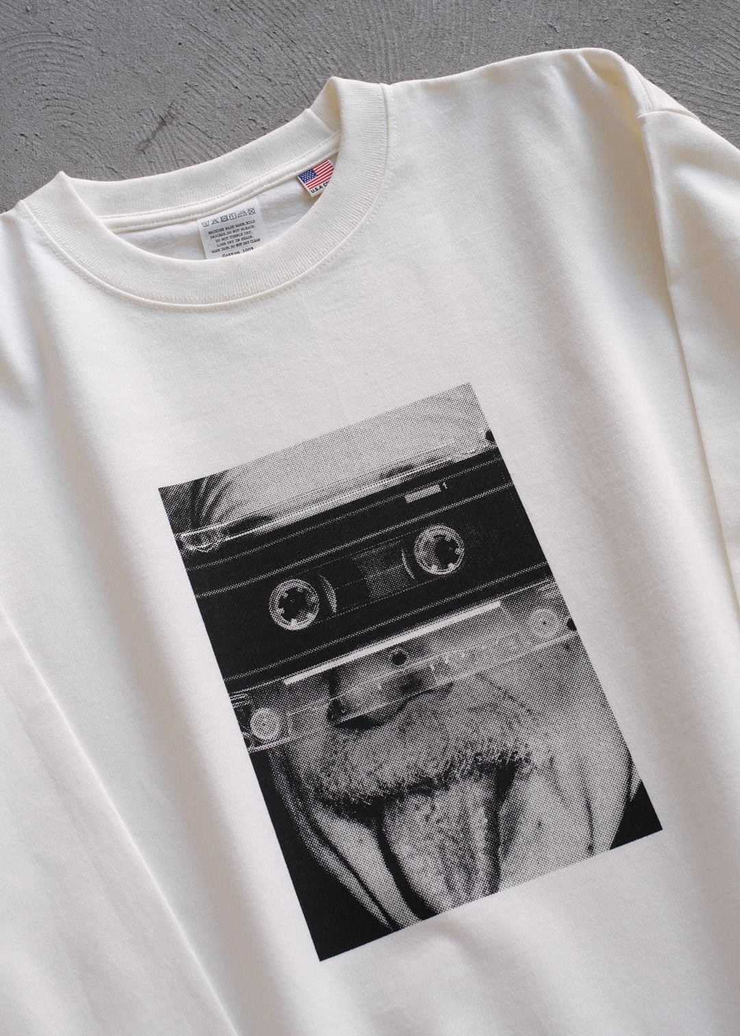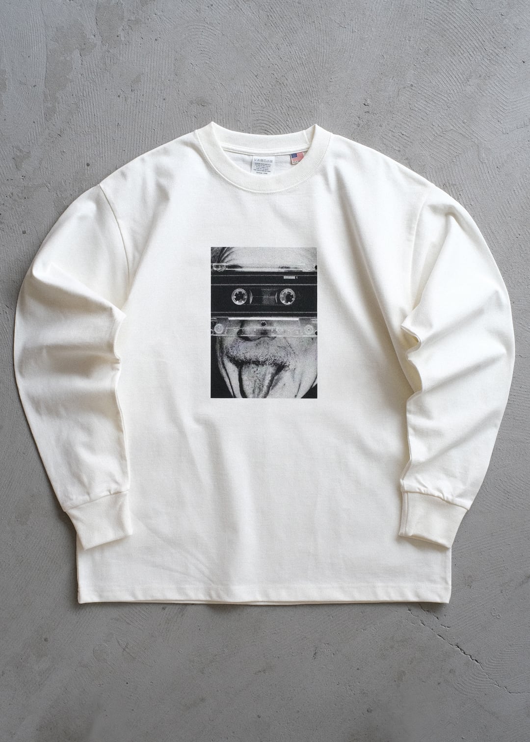 カセットテープで目隠しをしたアインシュタイン博士をプリントしたロングスリーブフォトTシャツ。写真は合成ではなく、写真とカセットテープを組み合わせて同時撮影しています。写真は網点を粗くし、あえてレトロ感を演出。音楽好き、特に私のようなカセットテープ好きの方にぜひ着用していただきたい遊び心のある一枚です。USAコットンを使用した8.1ozのしっかりしたボディーで、長くご愛用いただけます。
