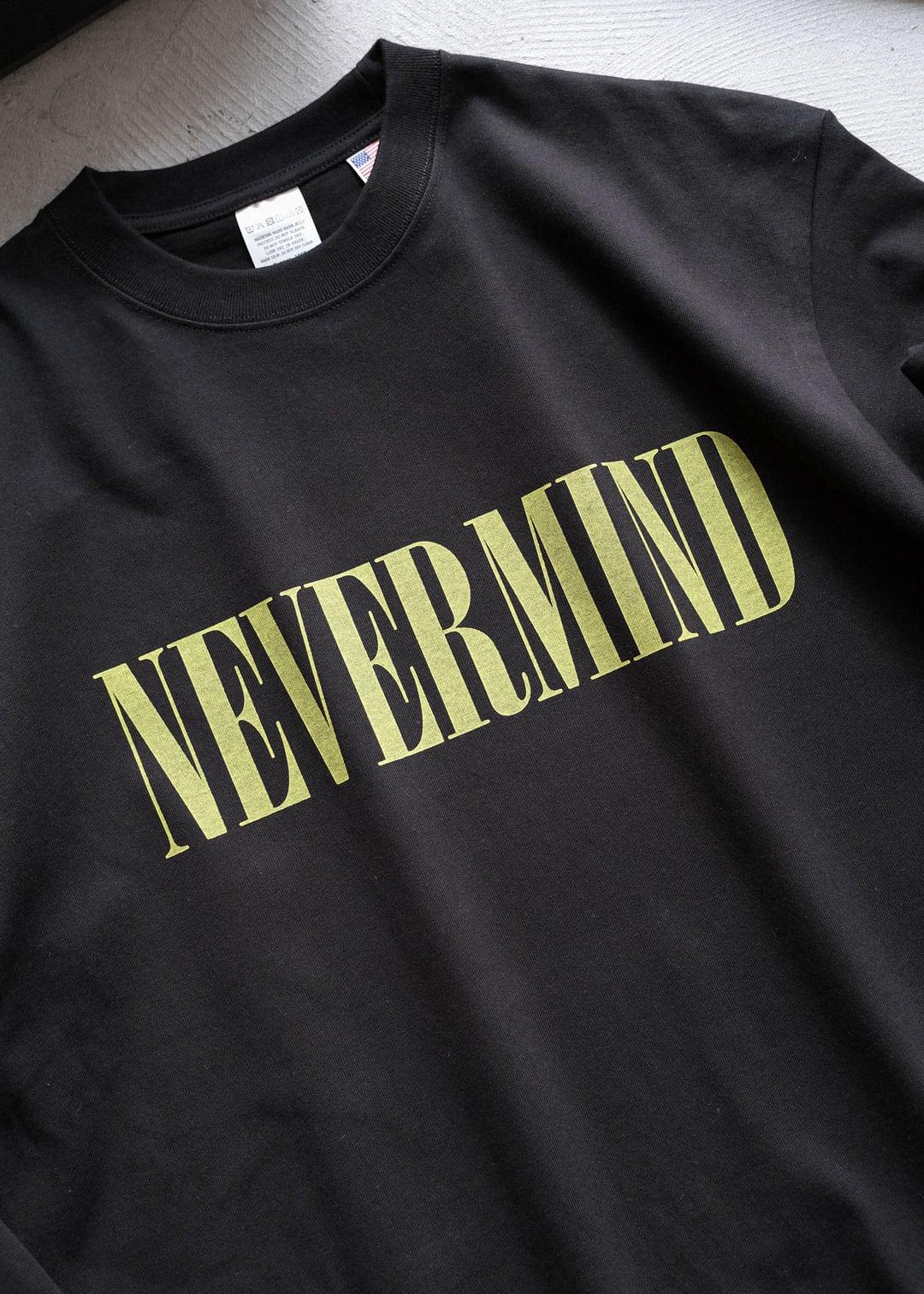 90年代を代表するグランジロックバンドNIRVANA。そのロゴに使用されているヴィンテージ書体「Onyx」で製作した"NEVERMIND" Tシャツ。背中にはKurtの言葉を大きくプリント。